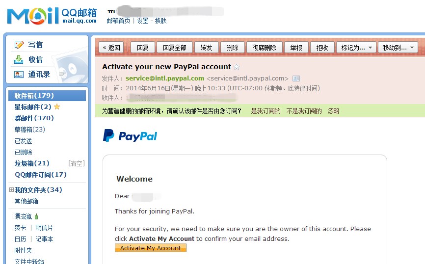 5、注册过程完成之后,PayPal 将会向您在注册阶段输入的地址发送一封电子邮件,此邮件会引导您进入一个可以确认帐户注册的链接。