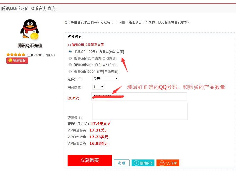 以Q币产品为例,小编为大家演示购卡流程。在网站找到Q币,选择好需要充值的数量,填写好正确的充值号码后,点击立即购买。